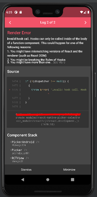 위 사진처럼 <PickerAndroid />에서 애러가 났는데, 위치를 보니 react-native-picker-select를 사용한 부분에서 애러가 났다.