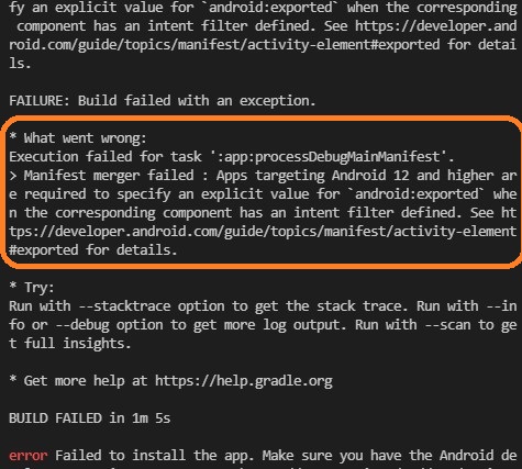 주황색 부분을 보면 Android 12 이상부터는 AndroidManifest.xml에 <activity />를 추가할 경우