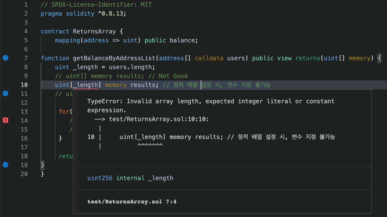 uint[] 안에 숫자가 아닌 지정한 변수를 넣었을때, 발생했습니다. 원인을 파악하기 위해 공식문서와 커뮤니티를 찾아봤습니다.