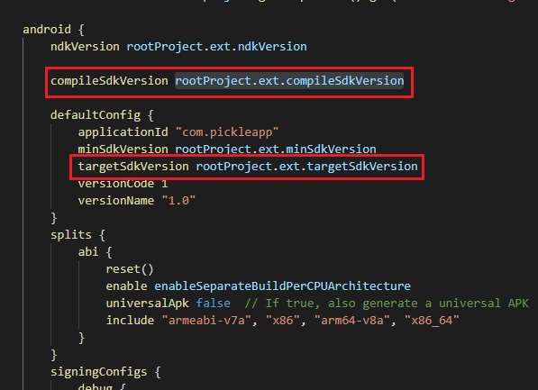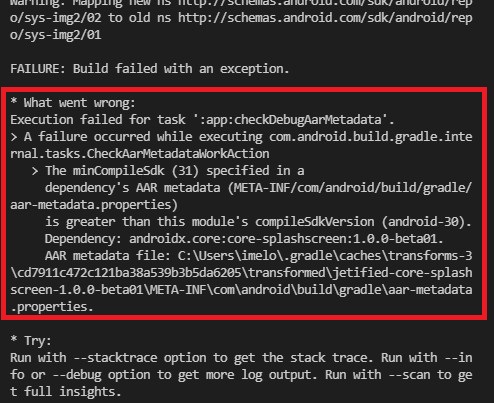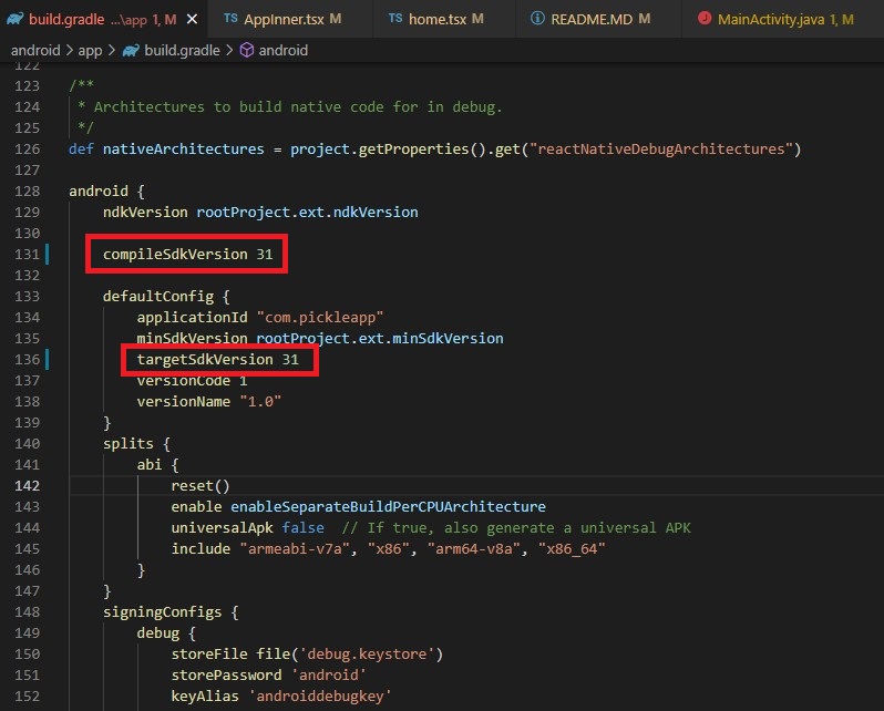 해결방법은 빨간 네모에 나온거 처럼 컴파일SDK 버젼과 targetSDK 버젼을 31 이상으로 명시하면 됩니다.